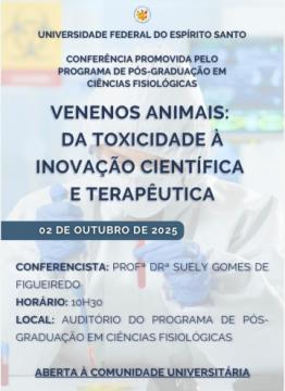 O Programa de Pós-graduação em Ciências Fisiológicas convida a todos para a palestra intitulada "Venenos animais: Da toxicidade à inovação científica e terapêutica" que será realizada no dia 02/10/2025(quinta-feira) das 10:30 às 12:00h no auditório do PPGCF.
